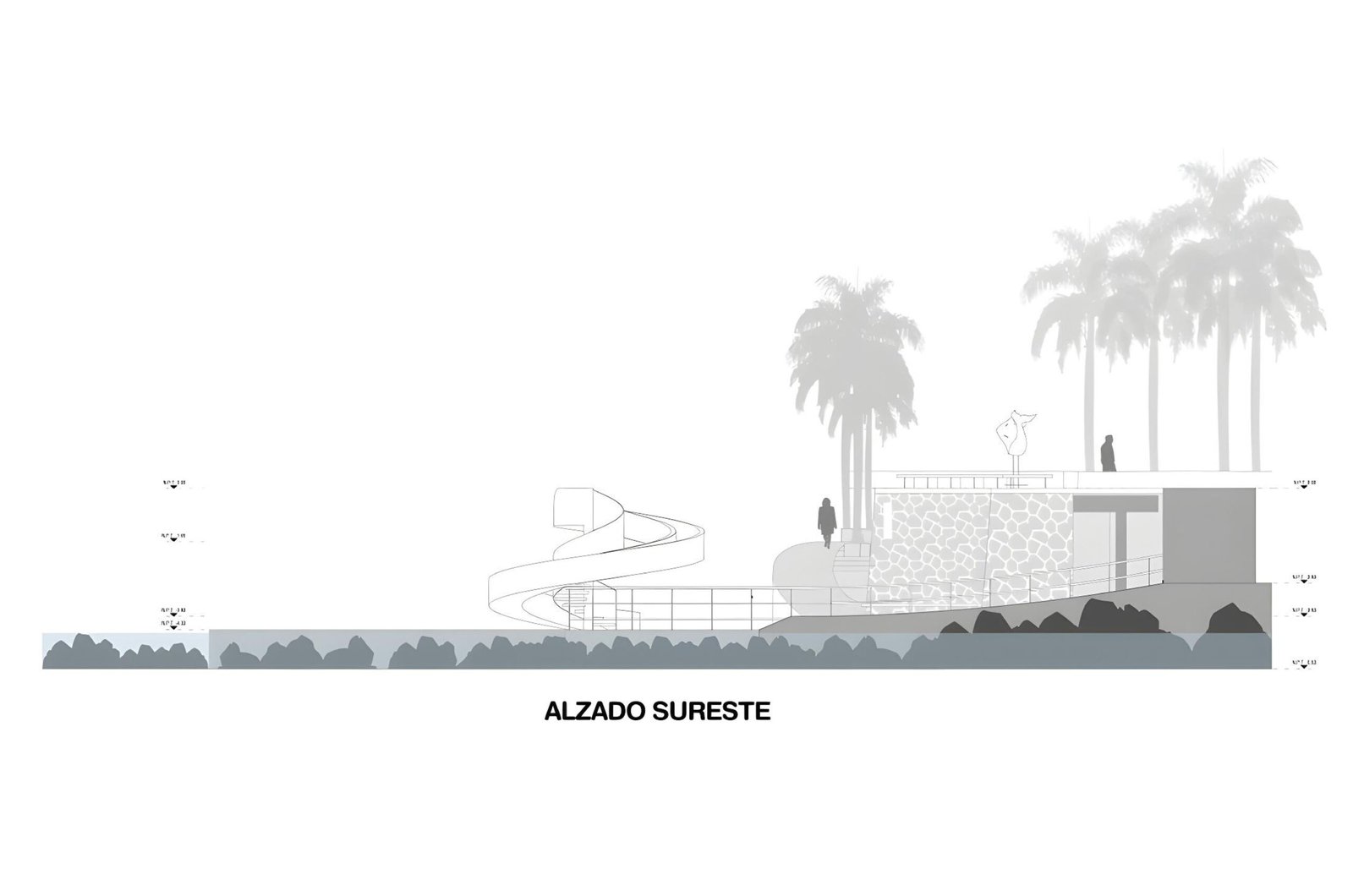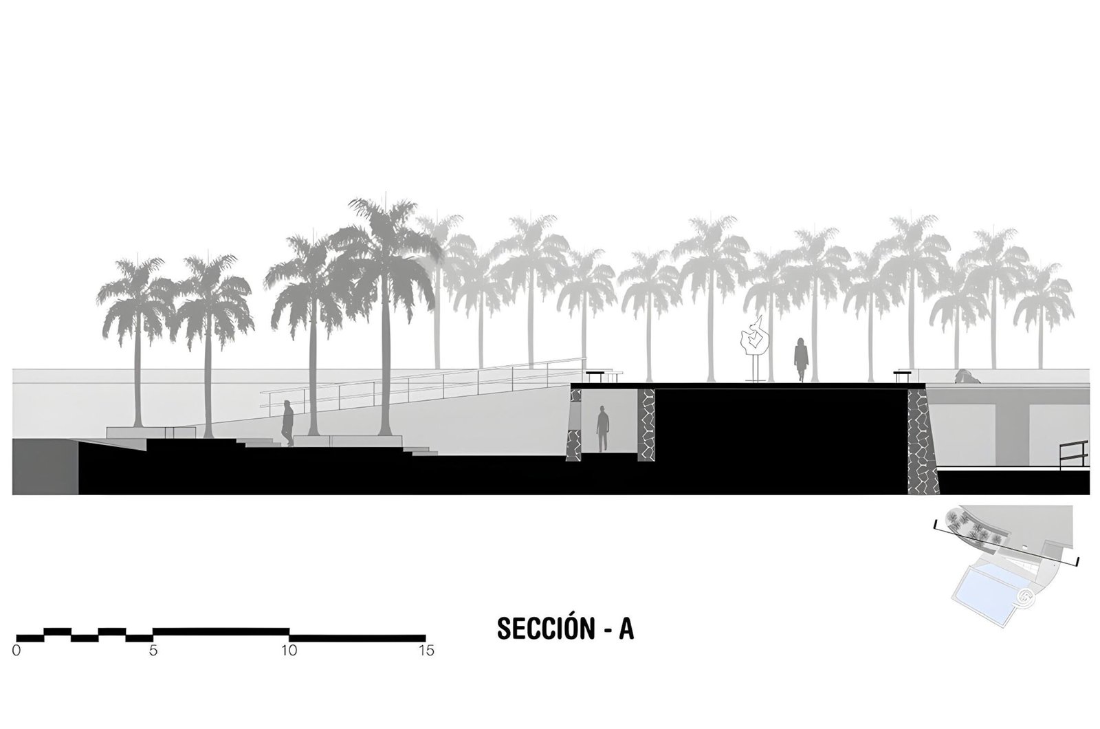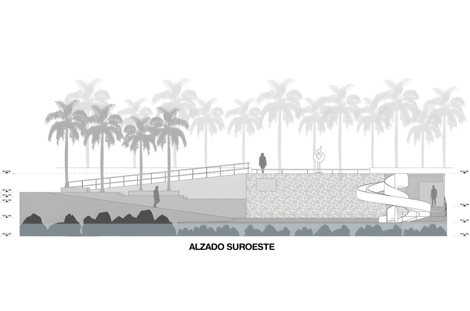 On its upper area, connected to the boardwalk we propose a plaza viewpoint that offers a surrounding bench to appreciate the horizon as the social activation on the public space. In the middle of the descending ramp there is a shaded area like an oasis of palm trees offering a tropical landscape.