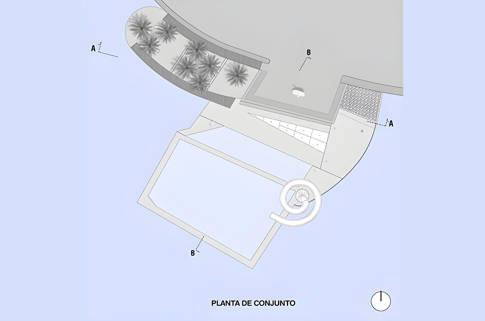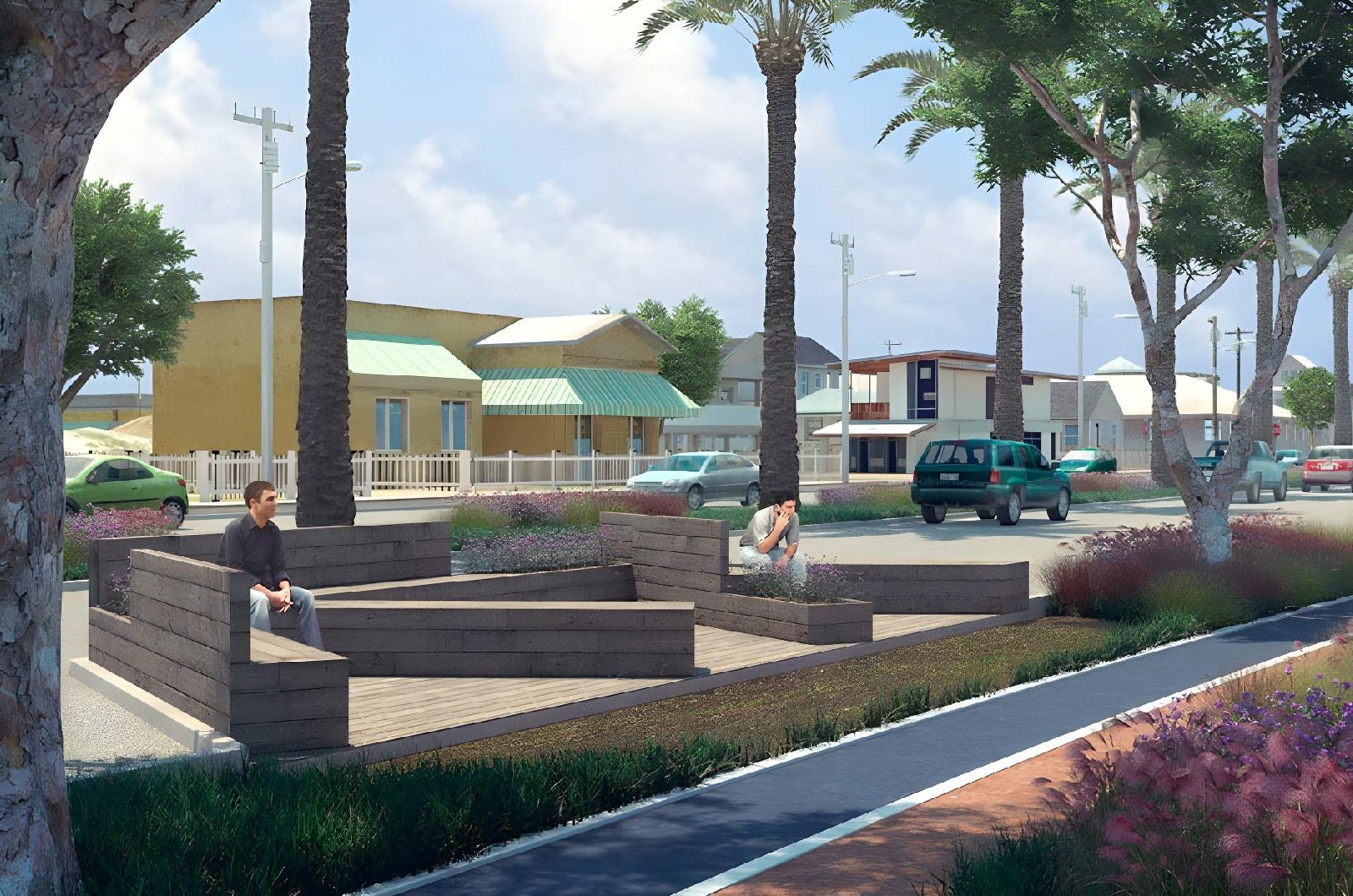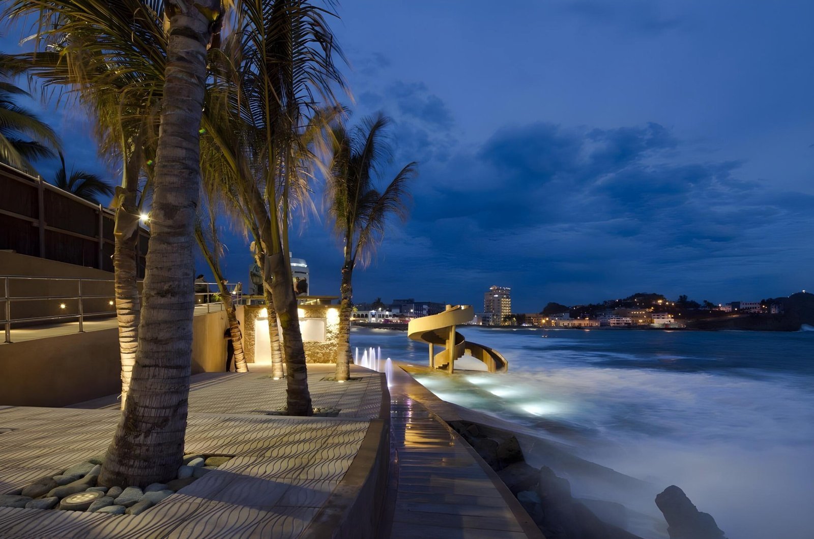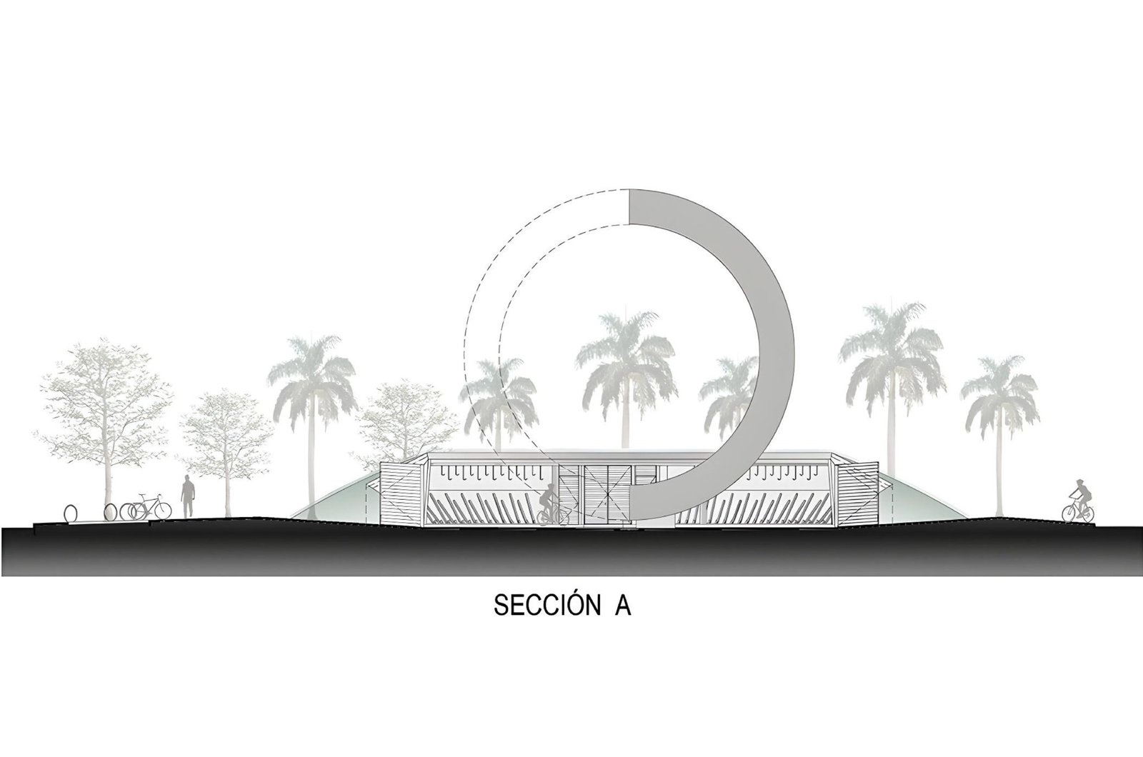 On its upper area, connected to the boardwalk we propose a plaza viewpoint that offers a surrounding bench to appreciate the horizon as the social activation on the public space. In the middle of the descending ramp there is a shaded area like an oasis of palm trees offering a tropical landscape.
