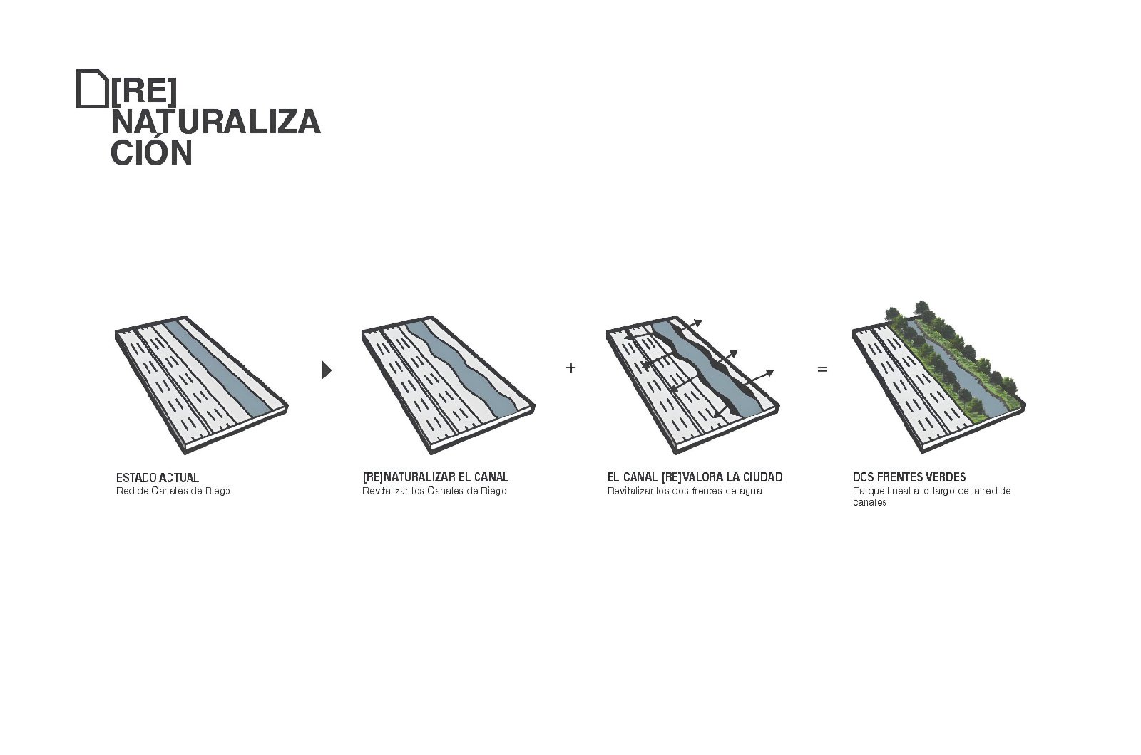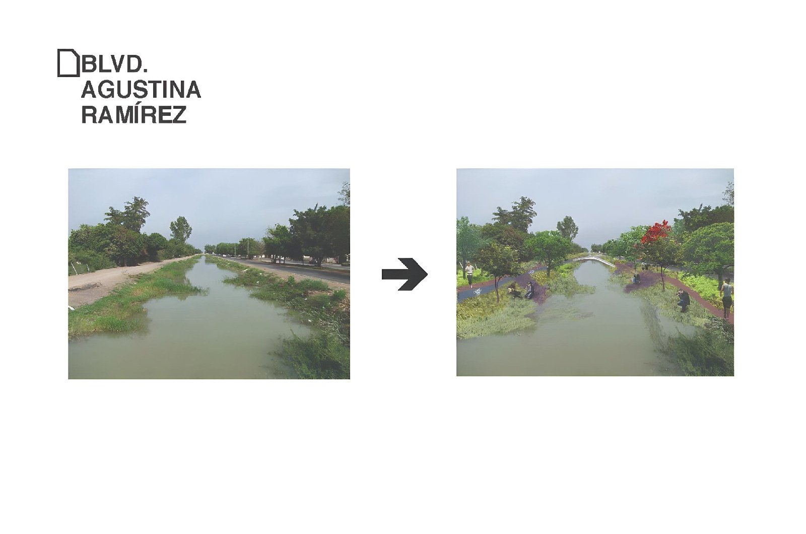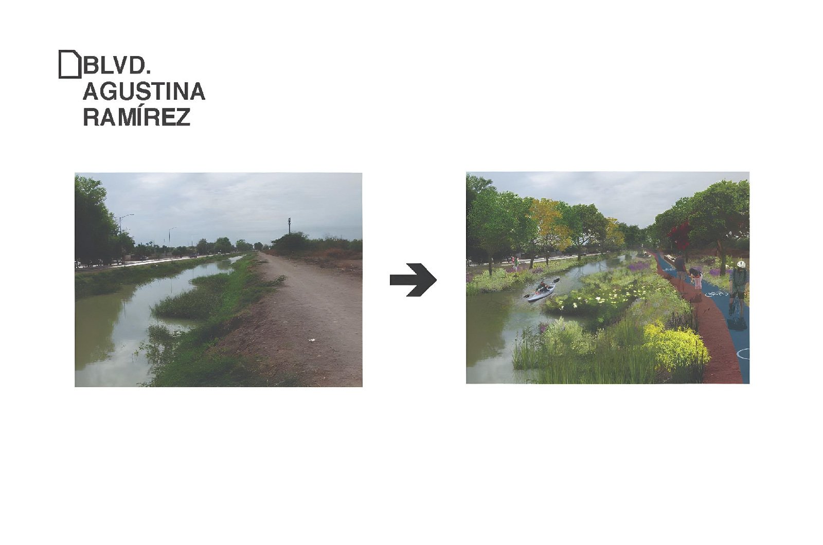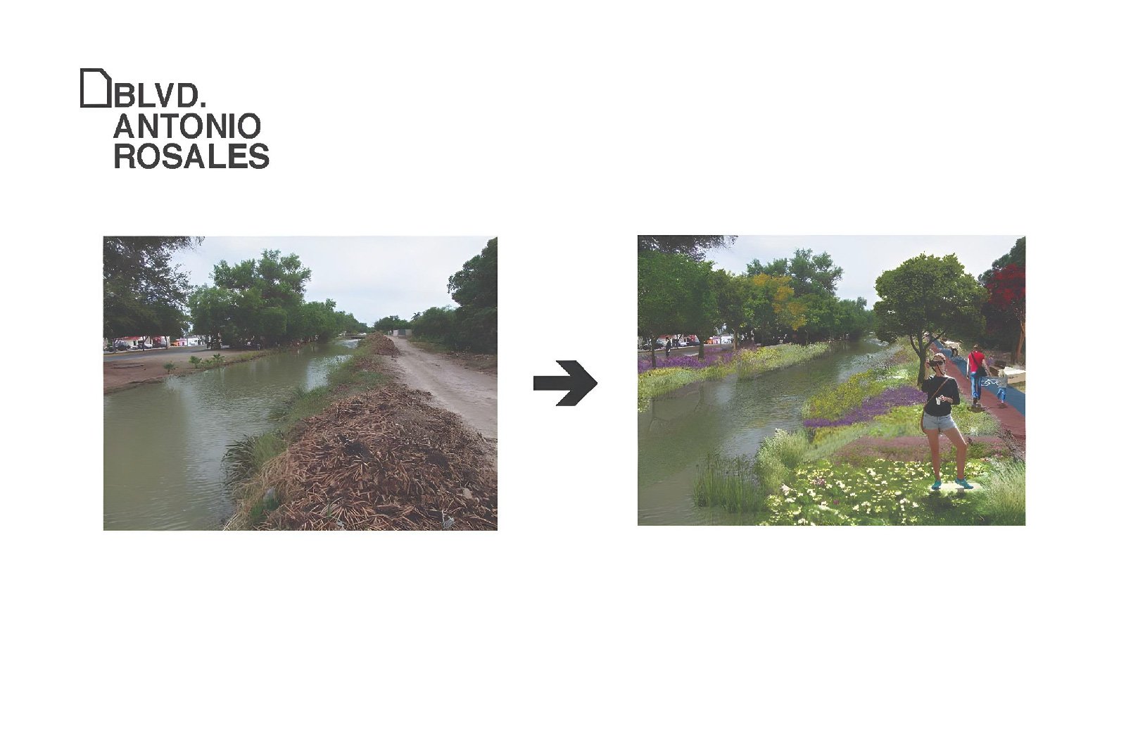 Nuestra propuesta se basará pues en intervenir todos estos espacios residuales que acompañan a los canales y drenes, integrando caminos peatonales, ciclo vías, bancas, puentes, playas, áreas verdes con plantas ideales para el clima local, y sobre todo árboles que generen sombra mejorando el microclima que atraiga a los habitantes a usar estos espacios.