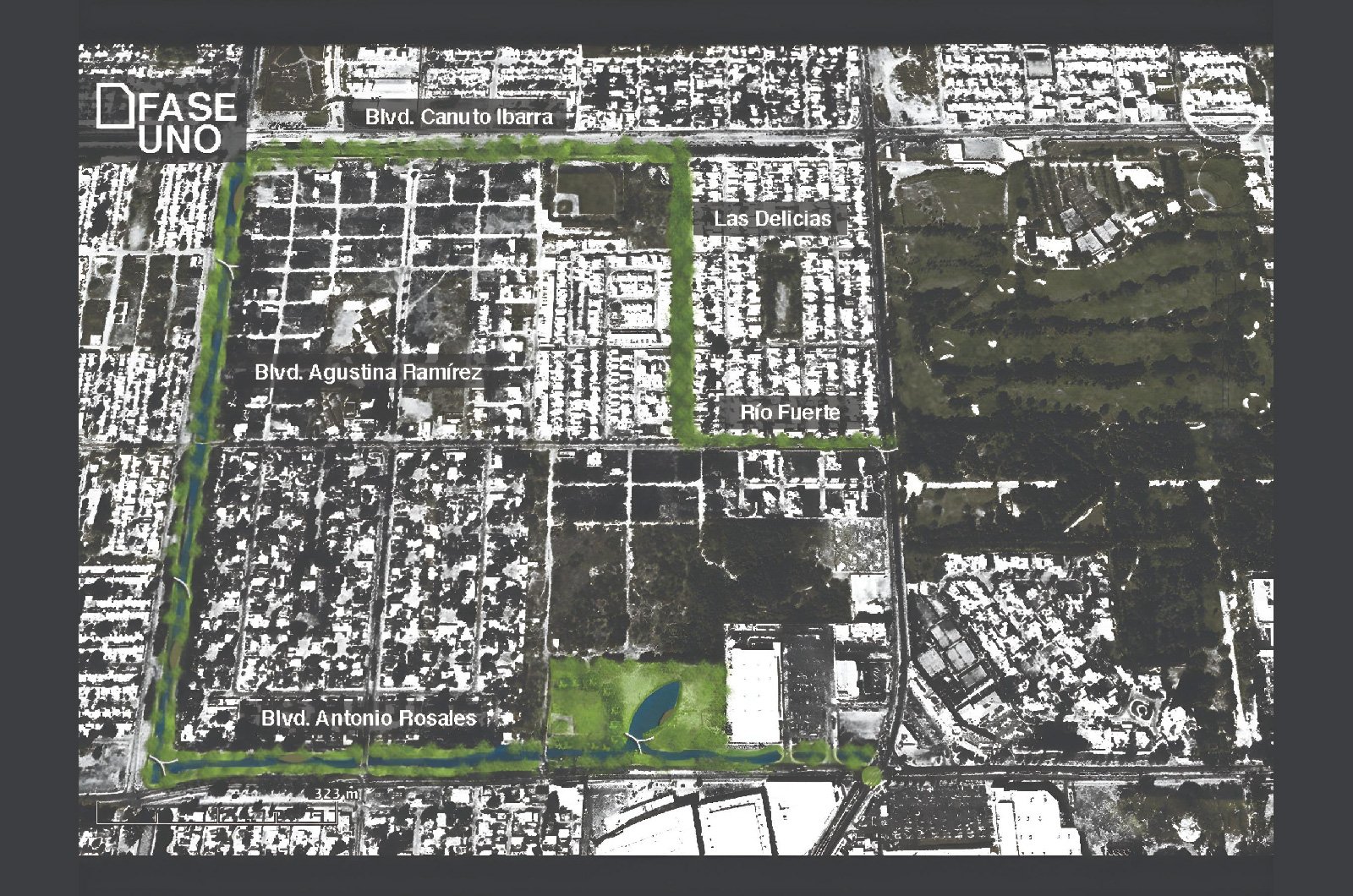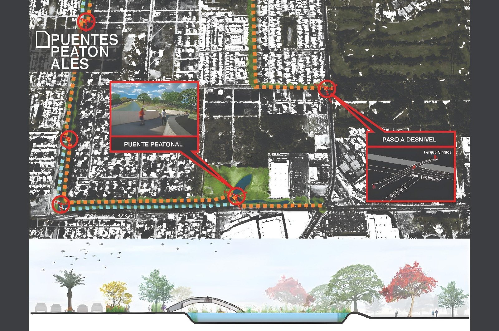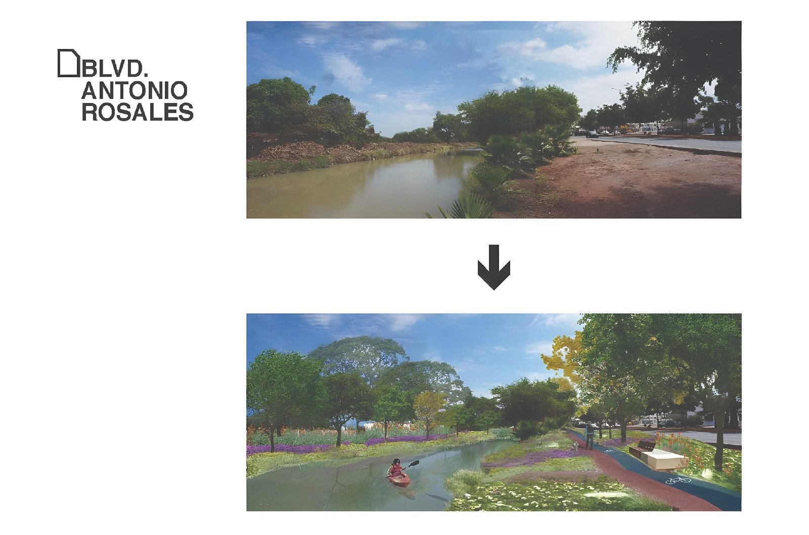 Nuestra propuesta se basará pues en intervenir todos estos espacios residuales que acompañan a los canales y drenes, integrando caminos peatonales, ciclo vías, bancas, puentes, playas, áreas verdes con plantas ideales para el clima local, y sobre todo árboles que generen sombra mejorando el microclima que atraiga a los habitantes a usar estos espacios.