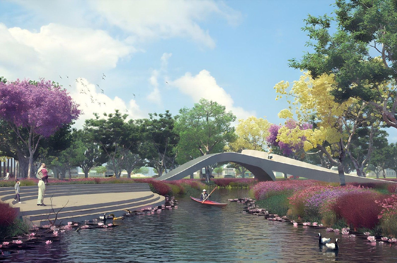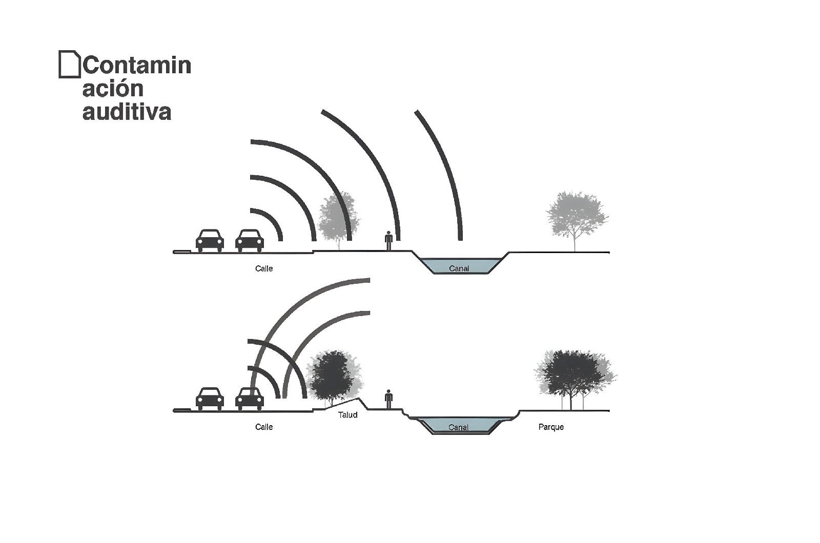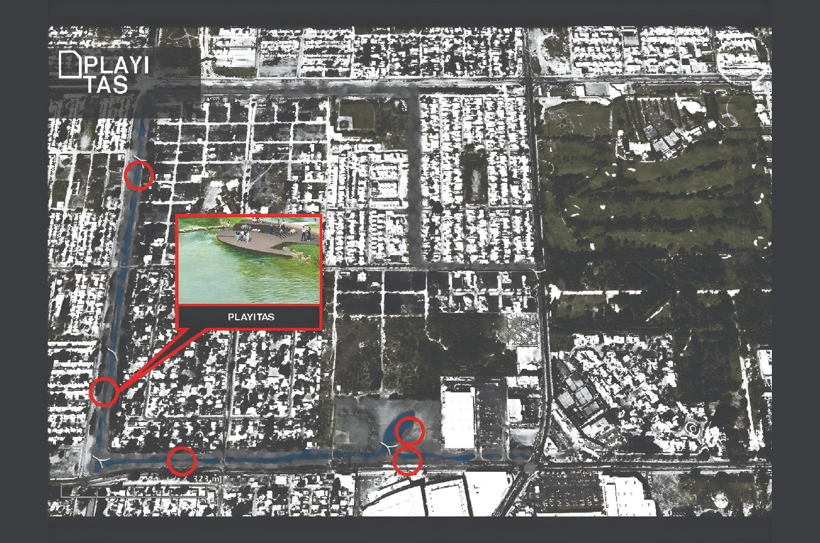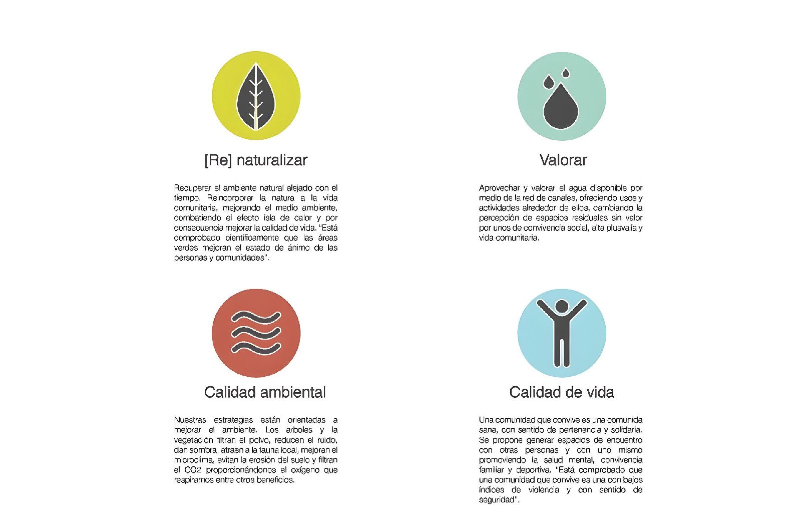 Nuestra propuesta se basará pues en intervenir todos estos espacios residuales que acompañan a los canales y drenes, integrando caminos peatonales, ciclo vías, bancas, puentes, playas, áreas verdes con plantas ideales para el clima local, y sobre todo árboles que generen sombra mejorando el microclima que atraiga a los habitantes a usar estos espacios.