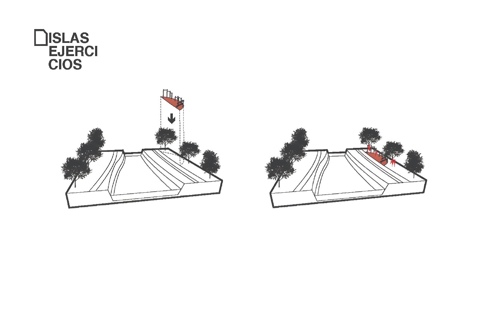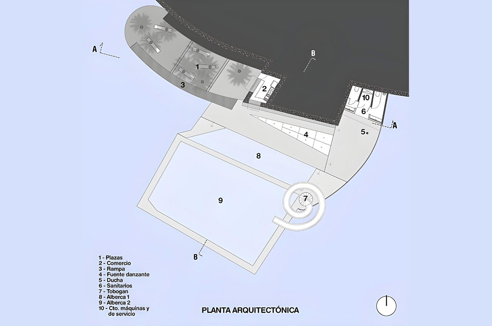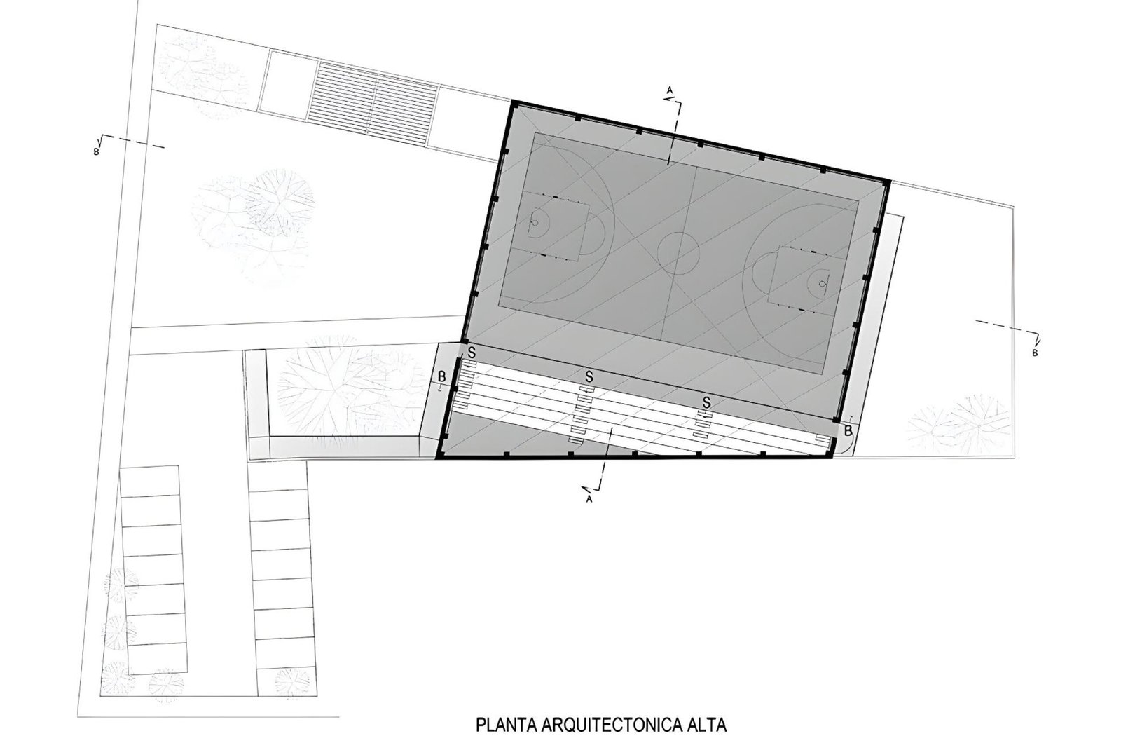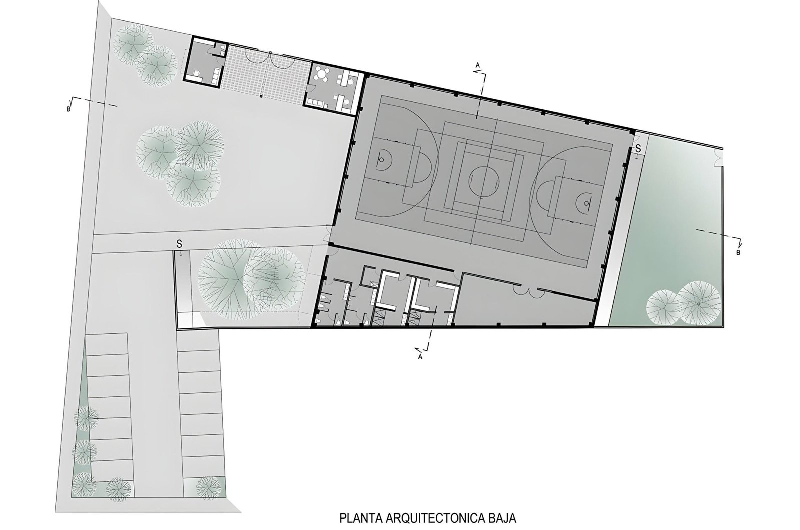The Secretaría de Desarrollo Social del Ayuntamiento de Mazatlán invites our studio to develop a pubic sports facility. On the aim to develop projects that encourage social well being on the second most important town in the municipality, we are given a terrain that is ideal for a use like this; We have a kinder garden on north, an IMSS clinic on east, Leon Marques street on west and a secondary school on the opposite corner. It is very important for us to link the immediate public context that is reinforced by our intervention. The strategy is to integrate and become a node that connects the different programs around us, letting access and circulations from the three public facilities around, clinic, school and street.