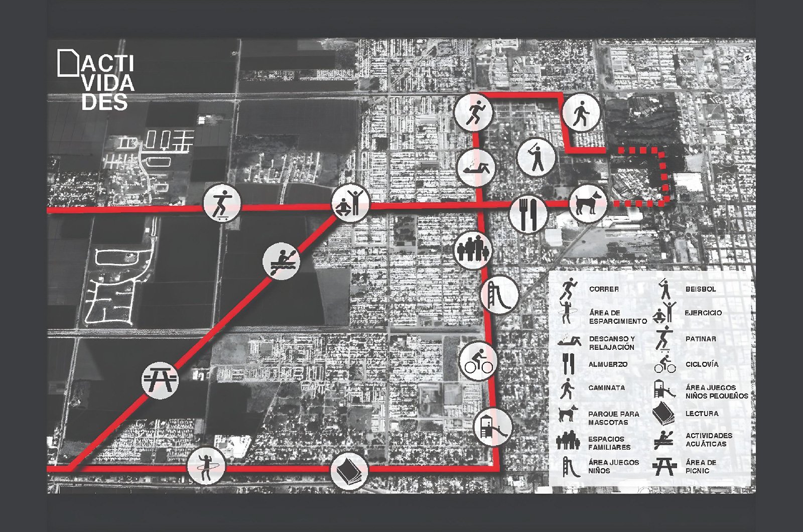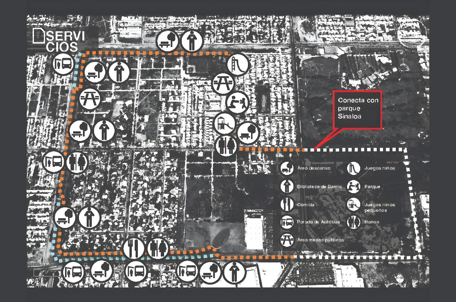 Por medio de la Secretaría de Desarrollo Social del Ayuntamiento de Mazatlán se nos invita a desarrollar un proyecto público deportivo. En el espíritu de desarrollar proyectos que ayuden al bienestar social de la segunda población mas importante del municipio, se nos entrega un terreno con una ubicación ideal para desarrollar un proyecto de este tipo, al norte colindamos con una escuela preescolar, al este con una clínica del IMSS, al oeste con la calle León Marques en la que a contra esquina se ubica una secundaria. Es muy importante para nosotros vincular al contexto inmediato de carácter público el cual se refuerza con nuestra intervención. La estrategia es pues integrar y servir como un nodo que conecte los diferentes programas que nos rodean, permitiendo accesos y circulaciones desde los tres edificios públicos vecinos, clínica, escuela y calle.