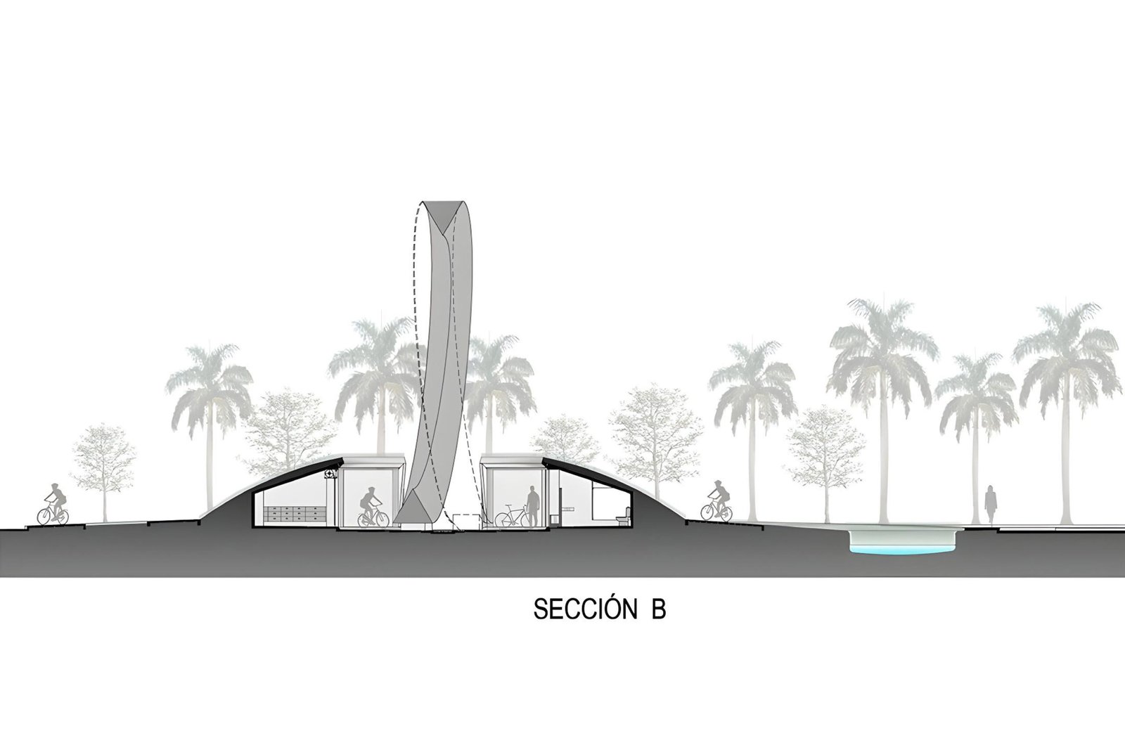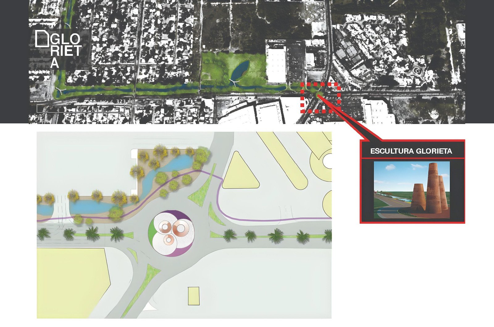 Se plantea la idea de hacer una escultura al centro del cráter, creando un hito urbano que sea fácilmente identificable, este se desarrolla con la idea de representar la movilidad ecológica y saludable que proporciona la bicicleta. La palabra bicicleta compuesta de bi: dos, y ciclo: serie de fases por las que pasa un fenómeno periódico hasta que se reproduce una fase anterior, representa muy bien esto.
