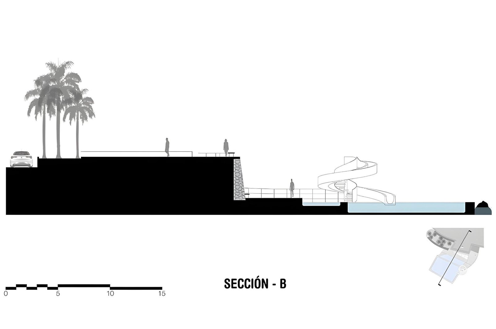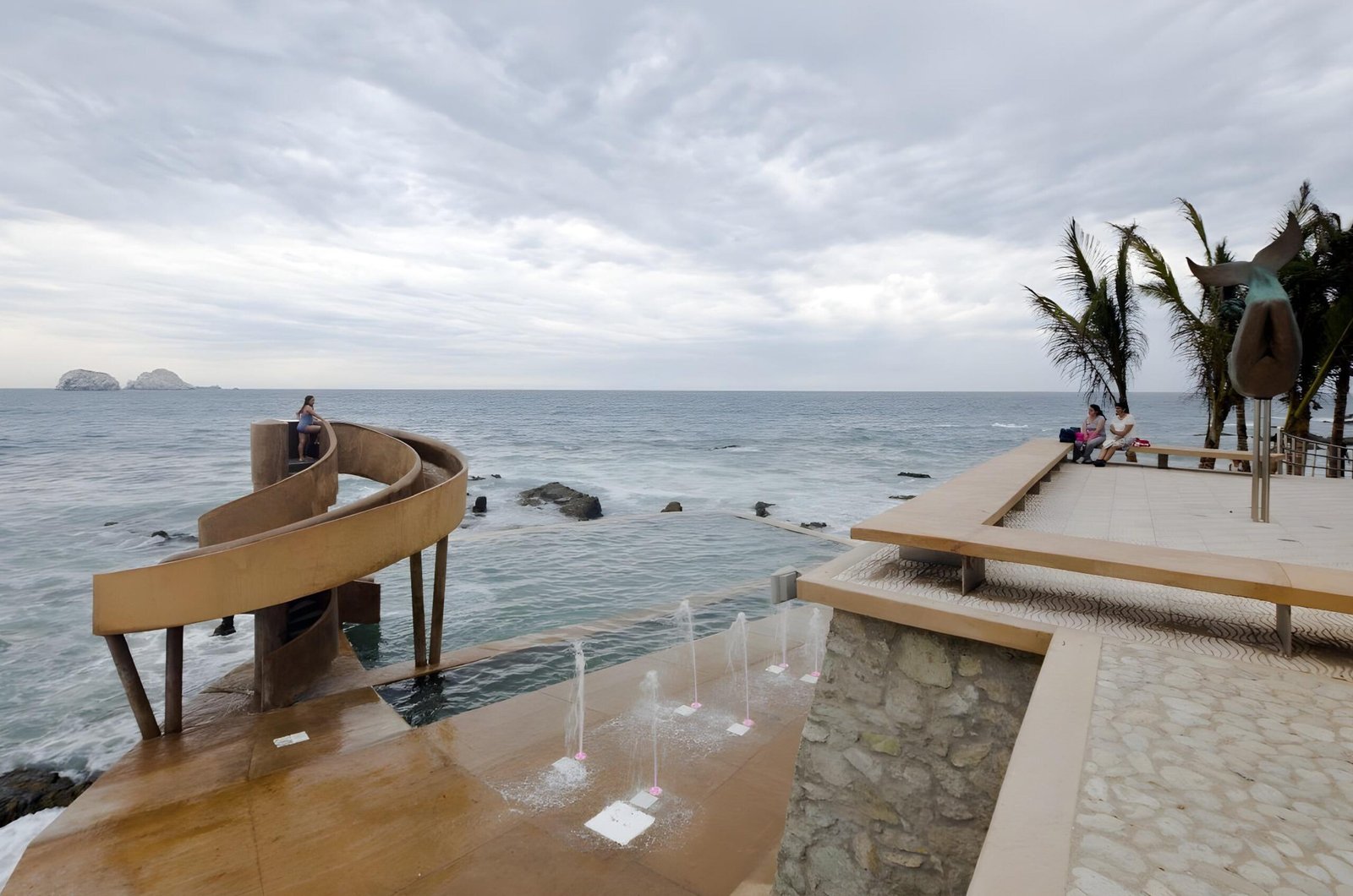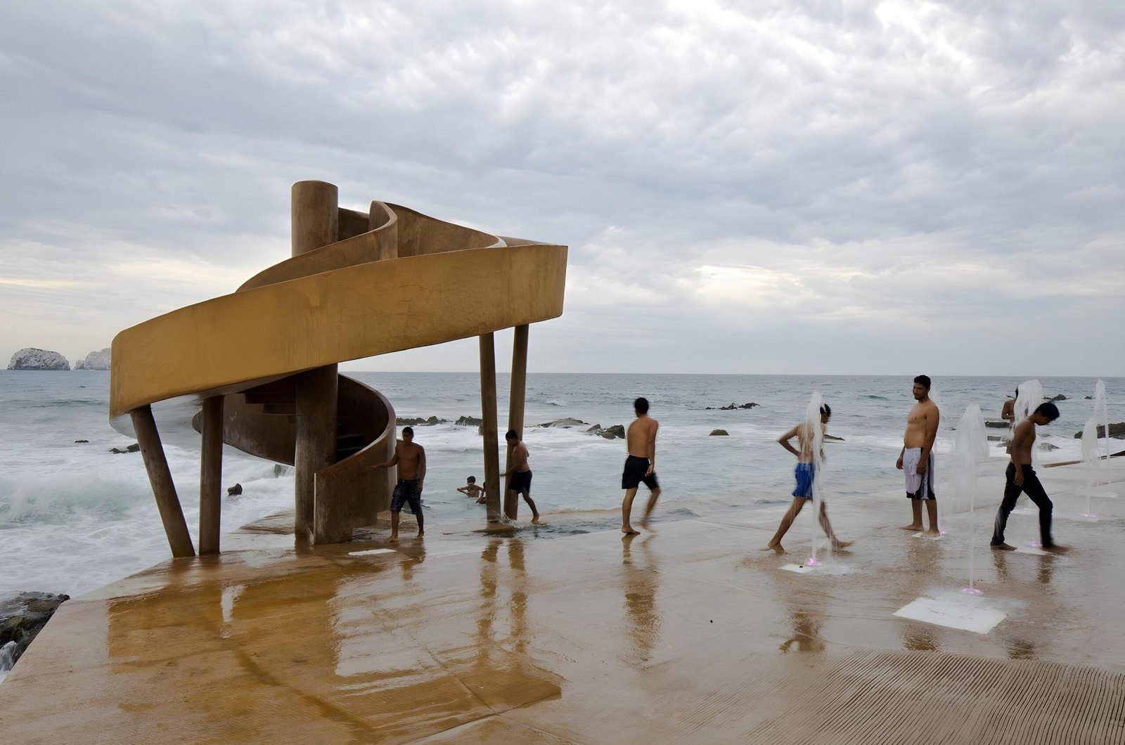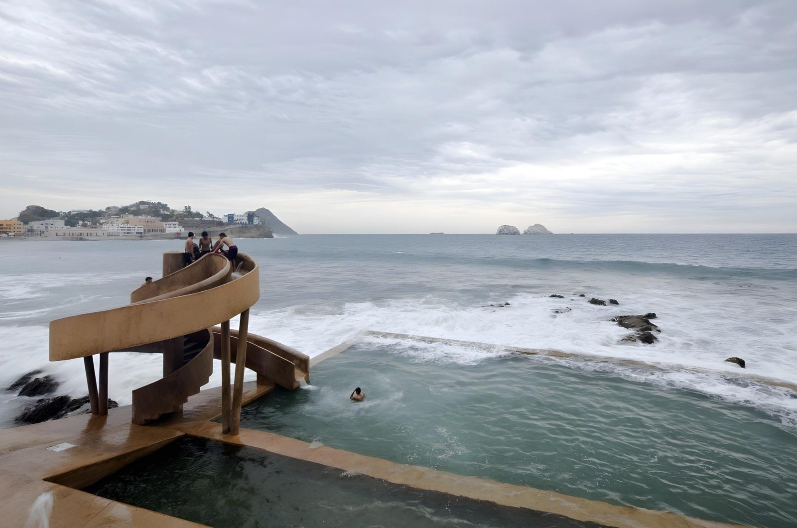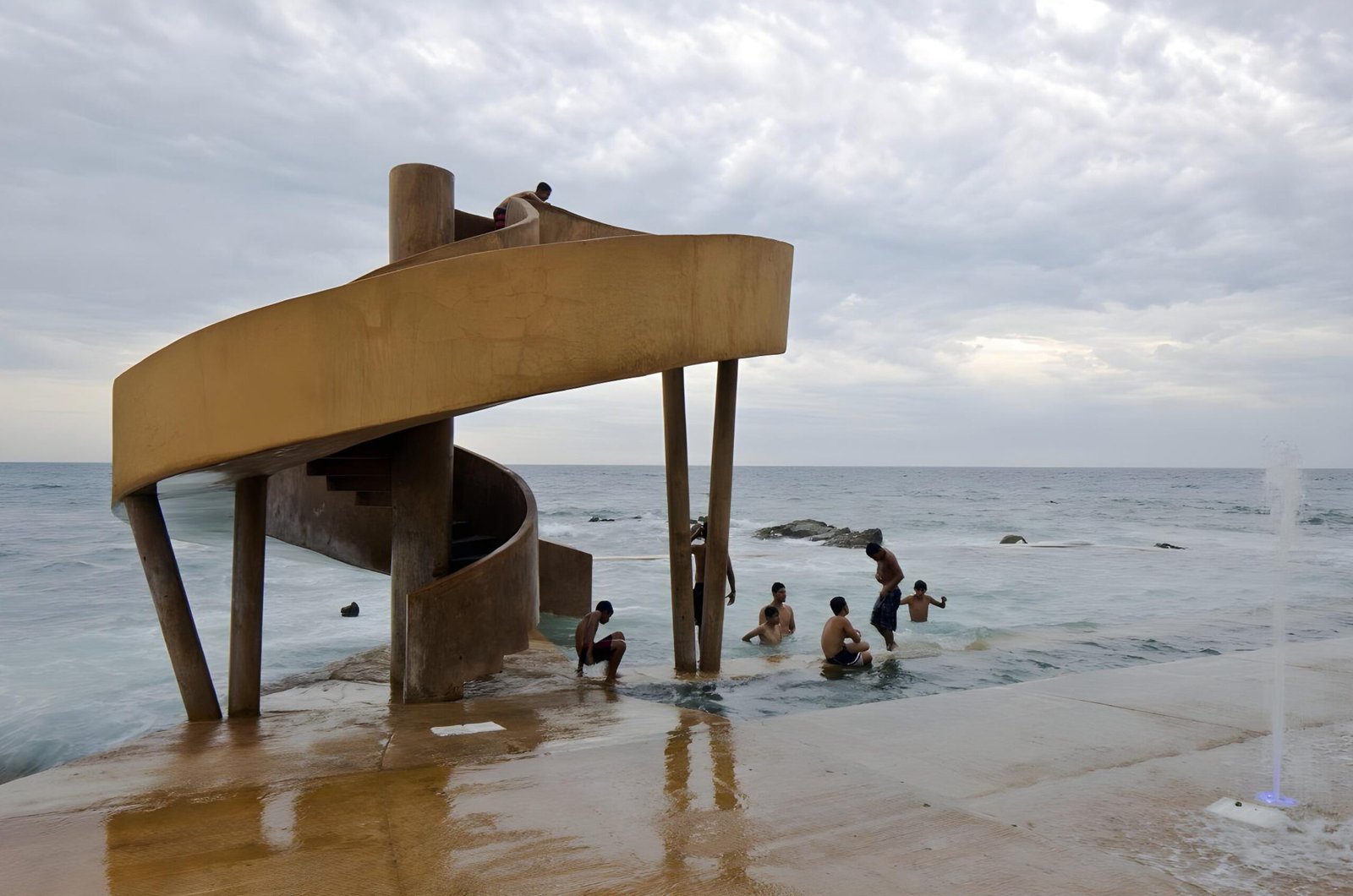 With the new municipal administration we are invited as a proactive team for the city to make a proposal for this public space. We propose to recycle, clean, and bring back the tide fed pool to its splendor. We also propose a playful element that will give social activation and will bring families and children to the area: a water slide with a singular design that will serve also as a sculpture creating an urban landmark. We propose a wind generator on the center of the water slide to provide electrical energy to the site and also as an element that will create awareness about the use of renewable energies.