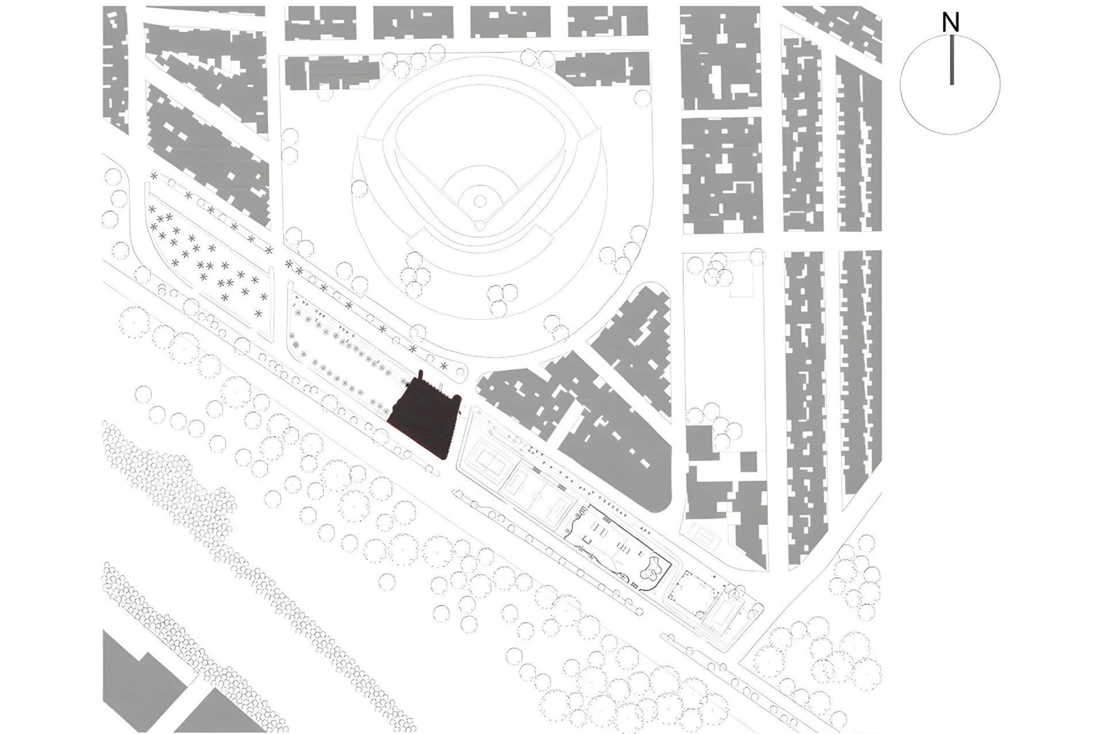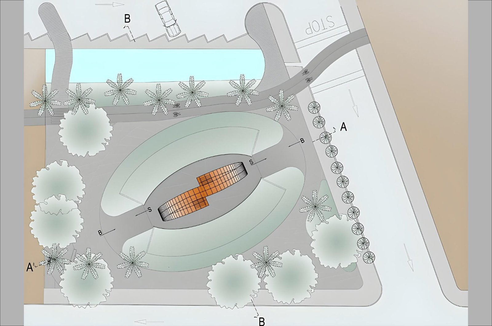 La idea generadora de la Comisión fue siempre aportar un elemento agradable a la vista y al ambiente urbano de la ciudad. Se desarrolla pues la idea de un “volcán” verde, que guarde bajo un talud recubierto de vegetación las bodegas y servicios que se requiere para su correcta función.