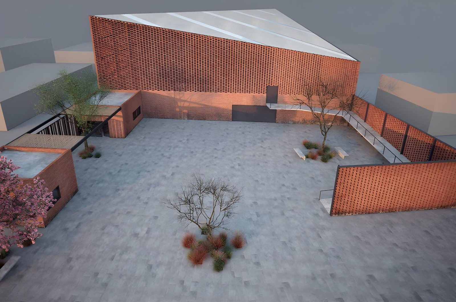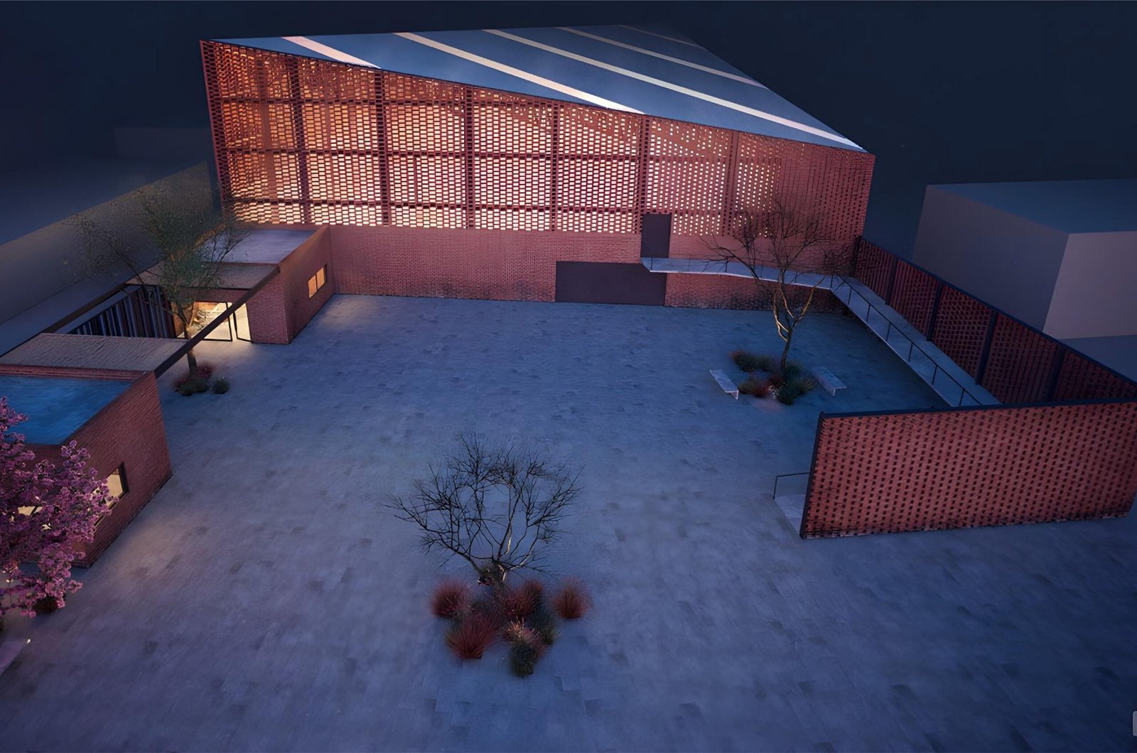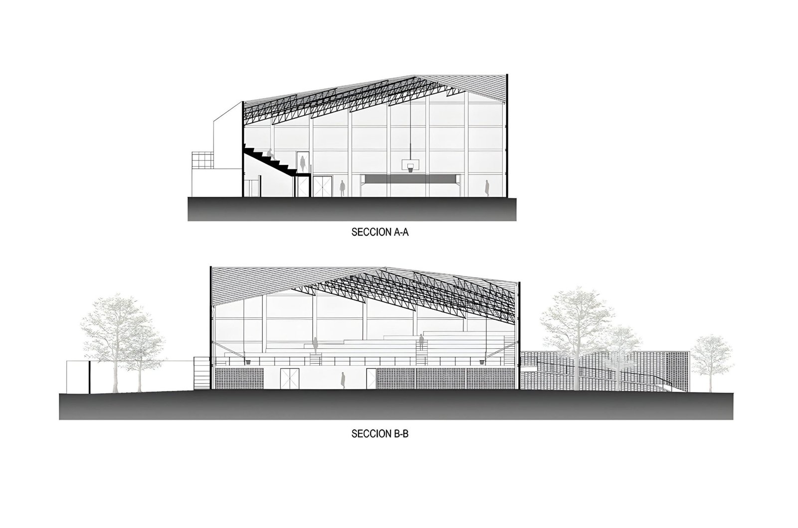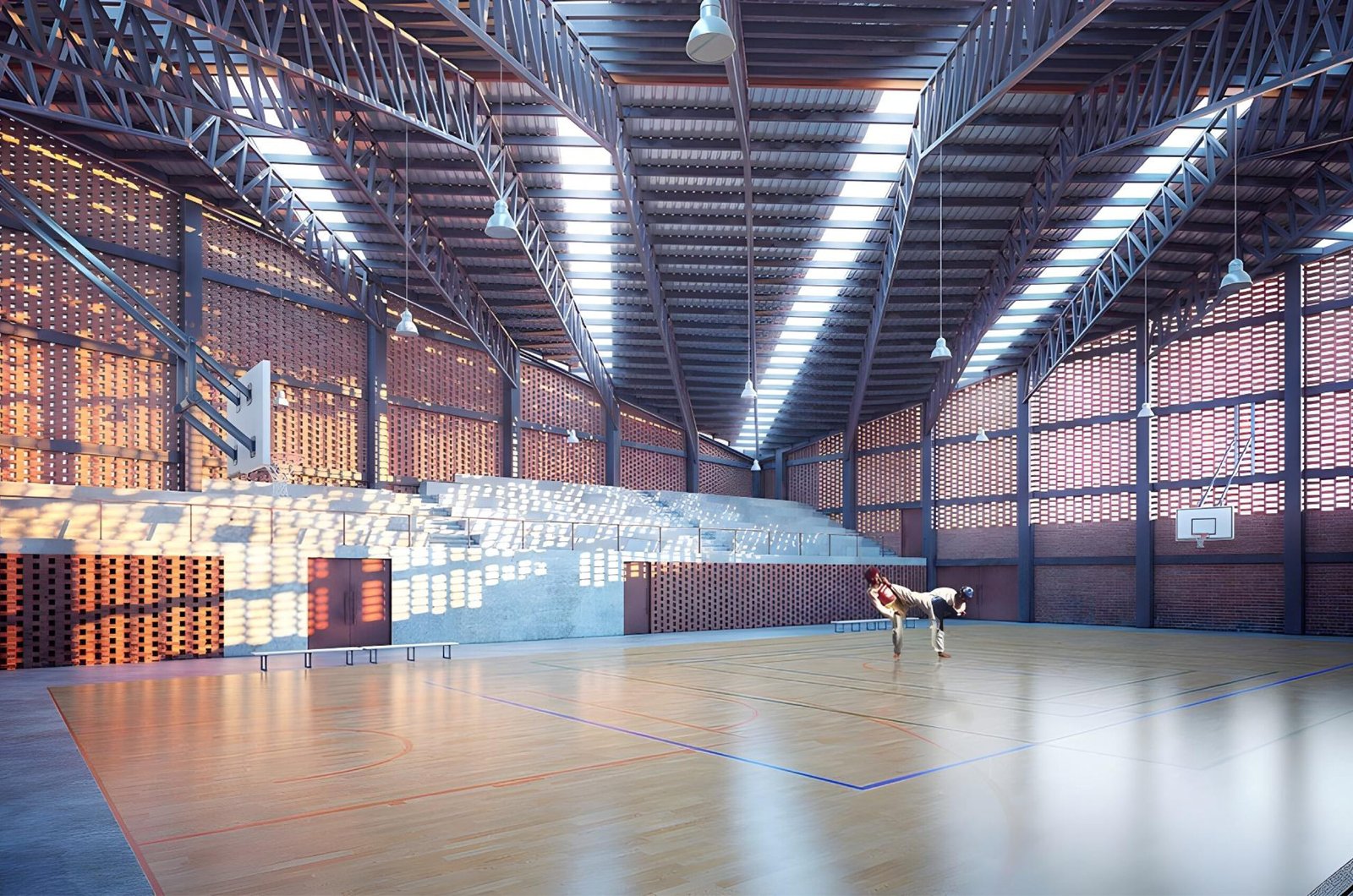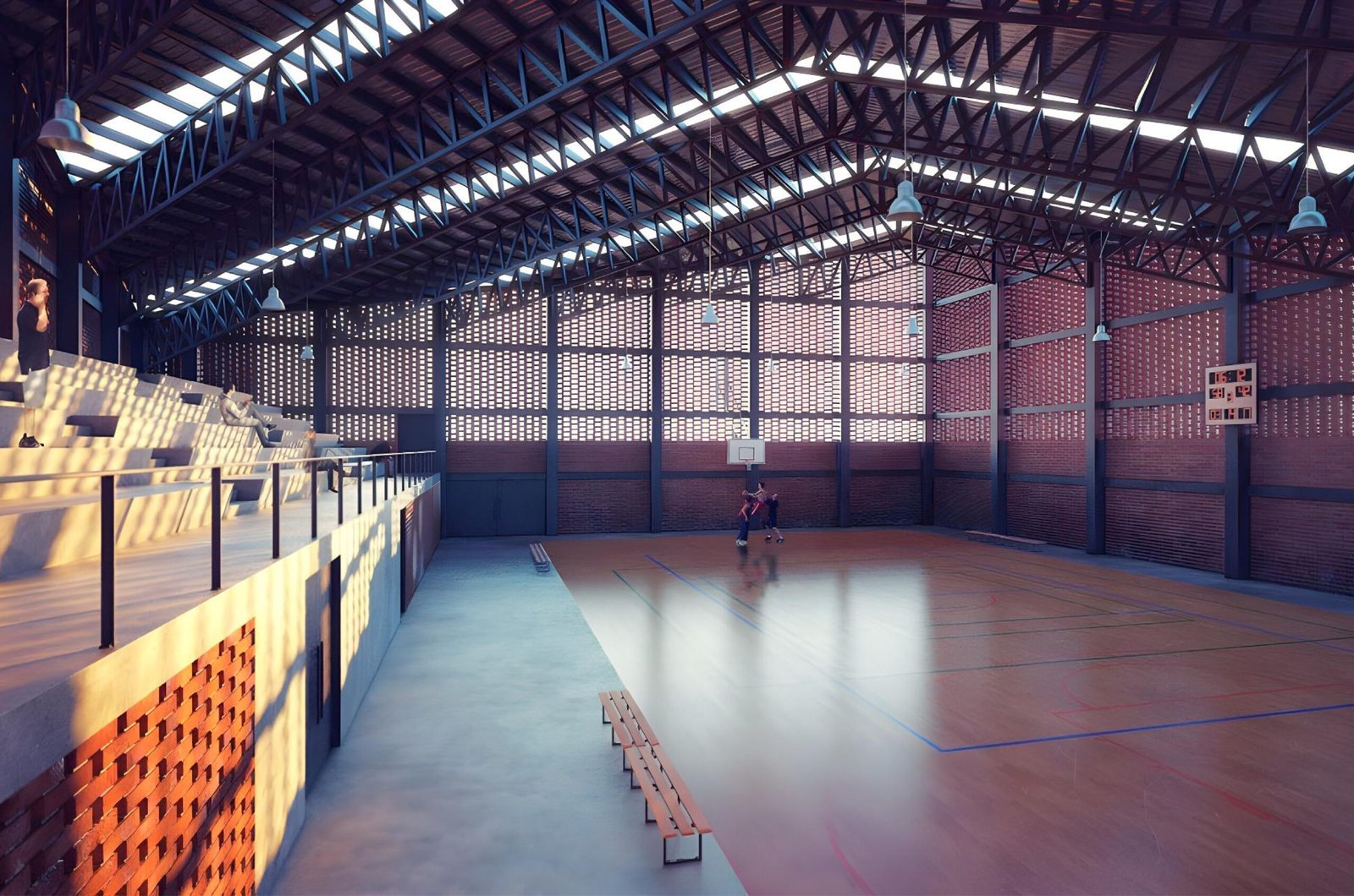 The sports hall ascendant form responds to its orientation, growing to its northwest corner that aims to efficiently catch prevailing winds to naturally cool the space. This is possible by an exposed brick lattice, being brick the material wrapping the entire building because is a typical material on this area, made close to the site. The materials proposed for construction is exposed steel, brick and concrete, letting out the need for high maintenance costs.